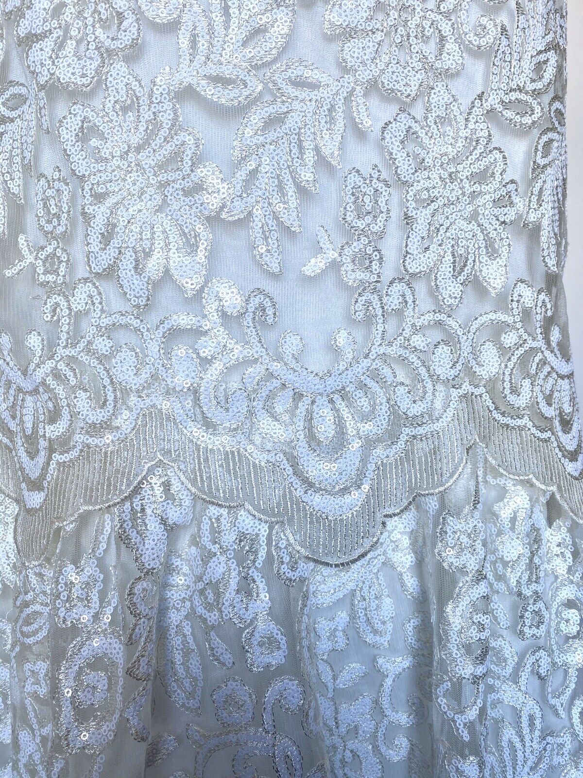 Floral sequin embroidered sheath dress with layer half way down with scalloped edge.