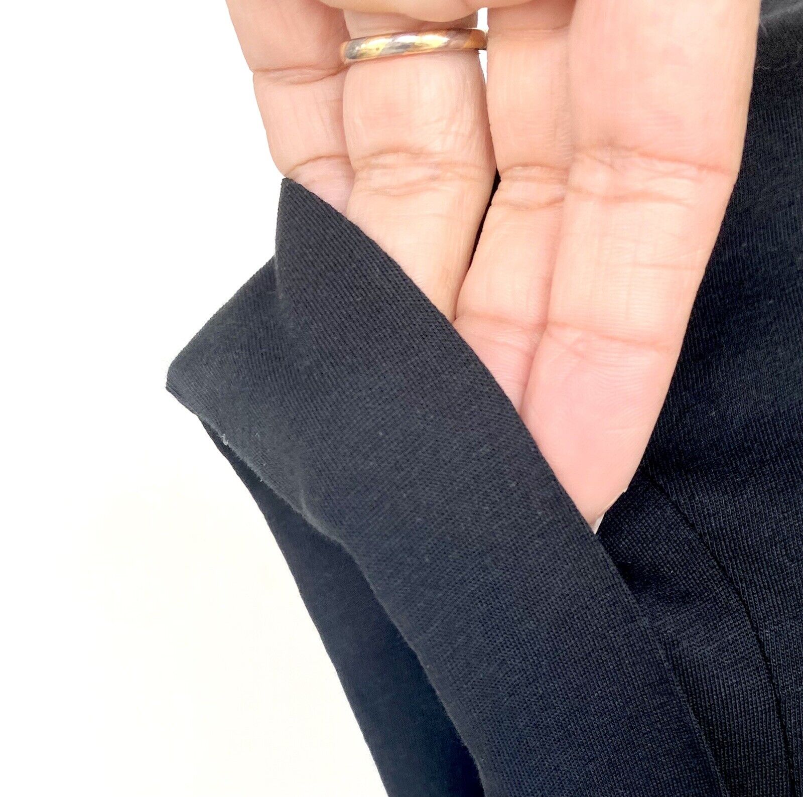 This hangs with a relaxed feel. The arm hole is folded over and stitched. It has a wider boxy body to give a slouchy feel.