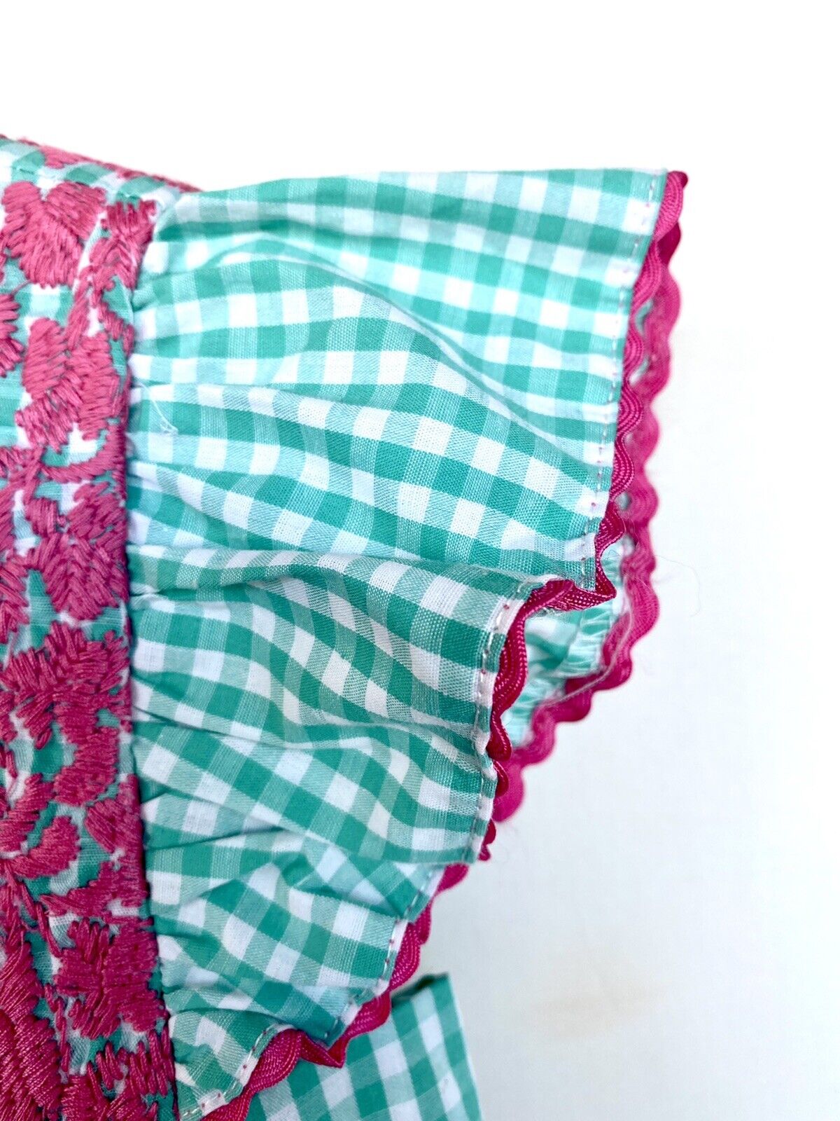 White and green gingham base with beautifully embroidered pink flower design.