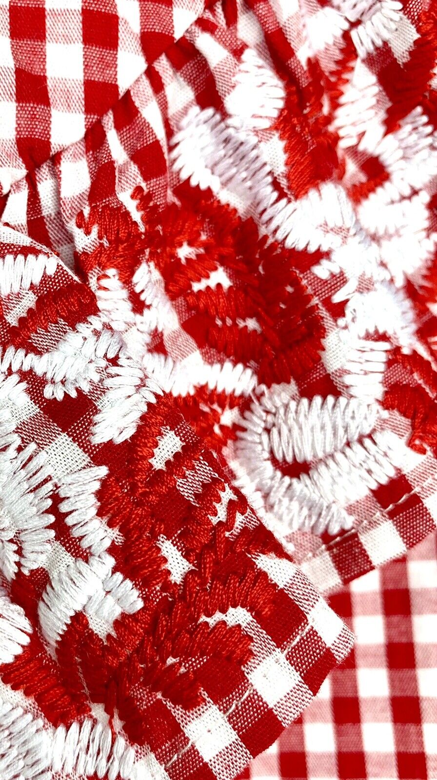 Red and white gingham check with beautifully embroidered White flowers down the front ruffle.