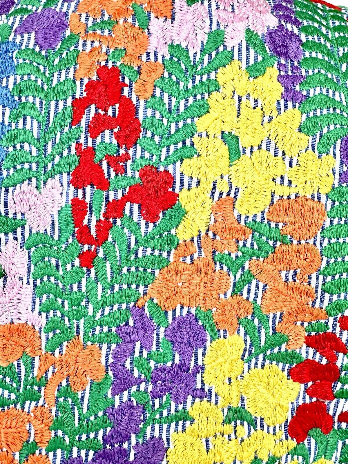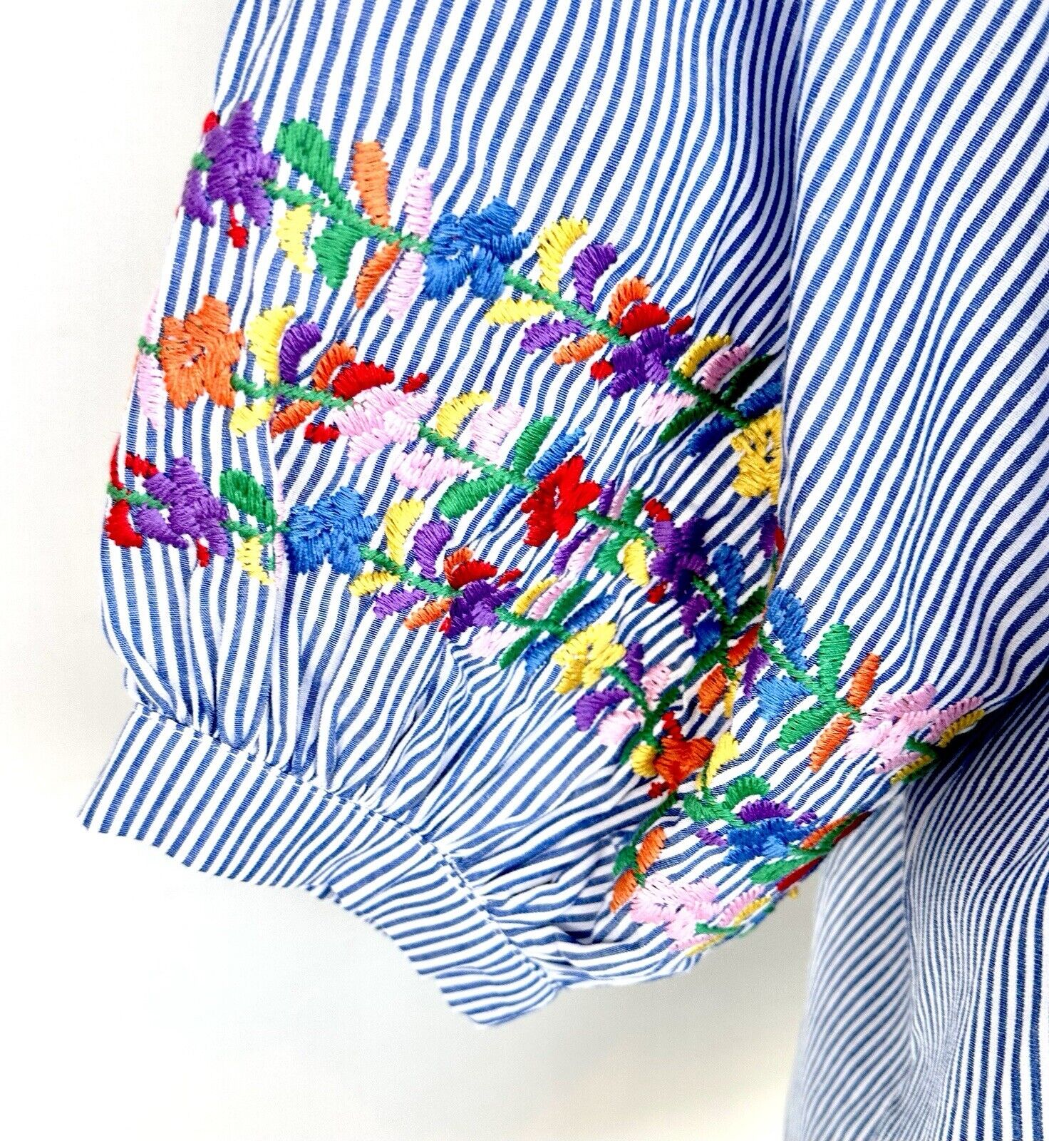 This J. Marie embroidered top in size XSmall is a must-have for any wardrobe. The white and blue striped base and multi color embroidery make it perfect for any season, whether it's summer, fall, or spring.
