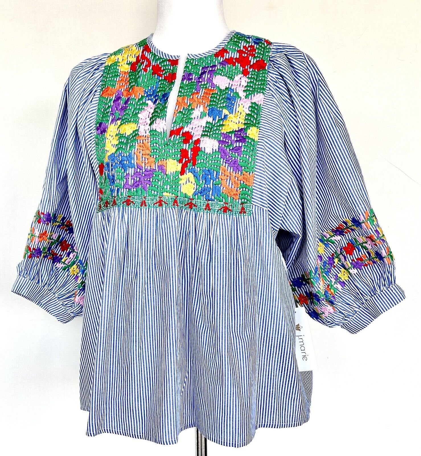 J Marie embroidered Tristan Top XS NWT Striped Blue Puff Sleeve Retails $146
