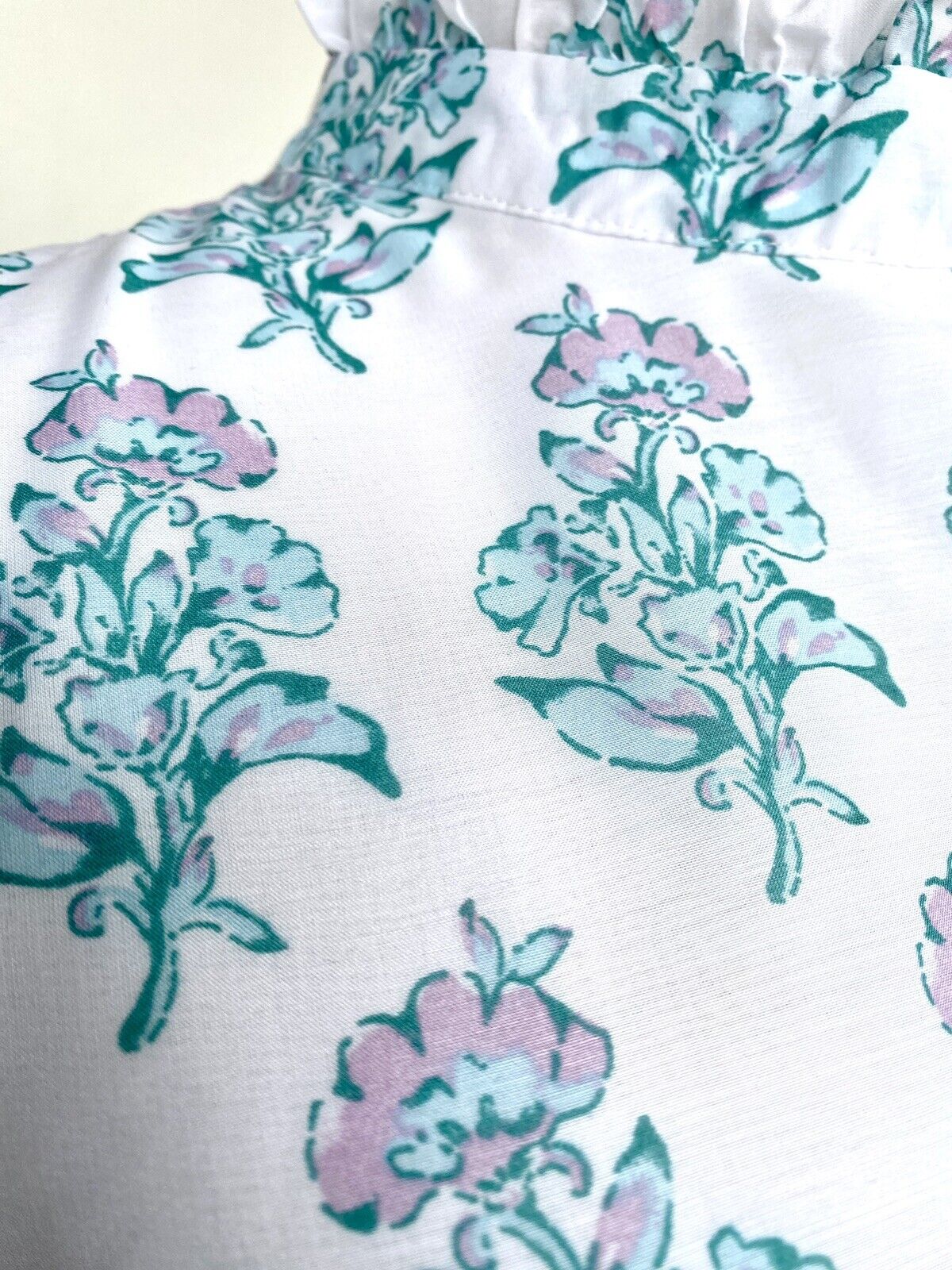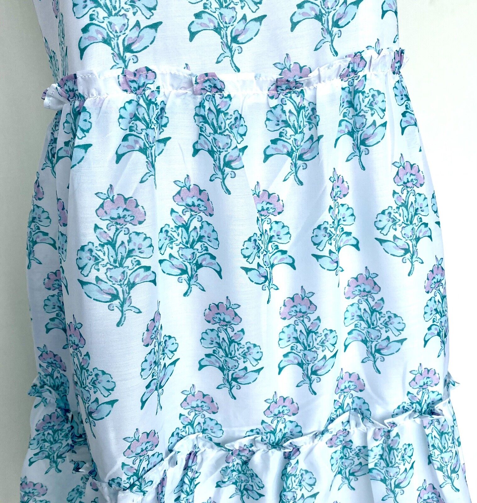 Beautiful ruffle detail along the tiered edges of the skirt and around the neckline.