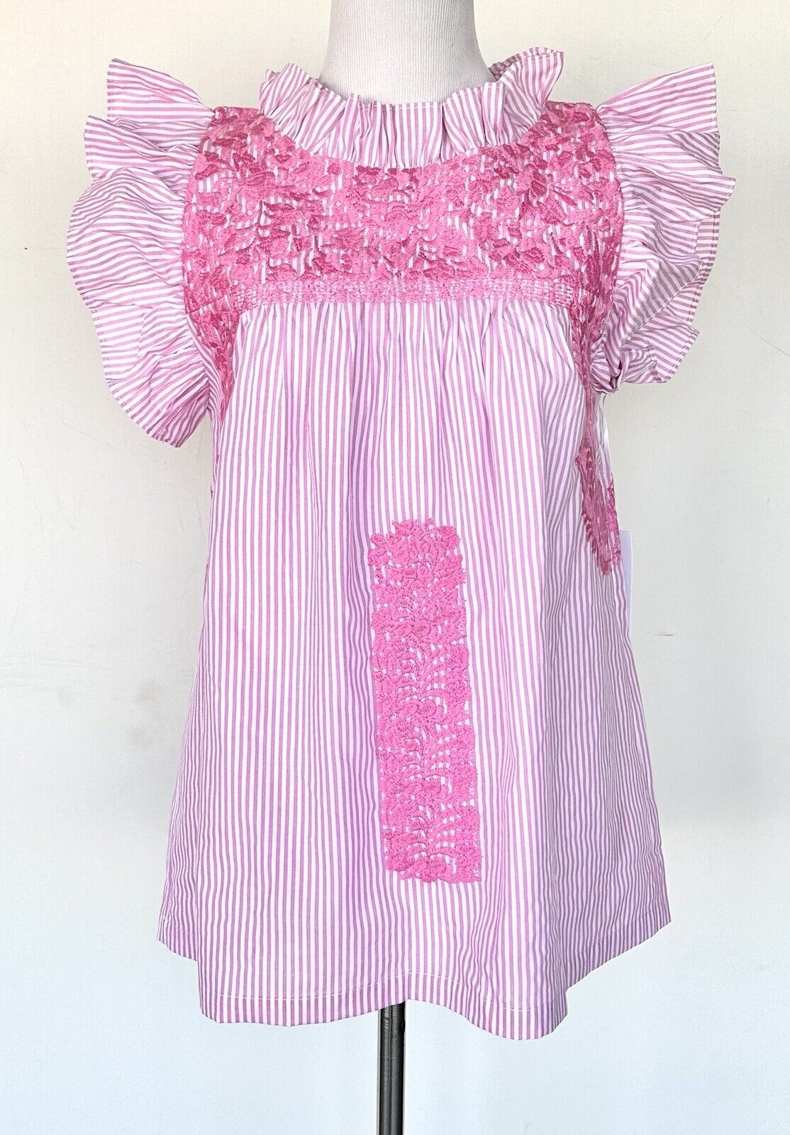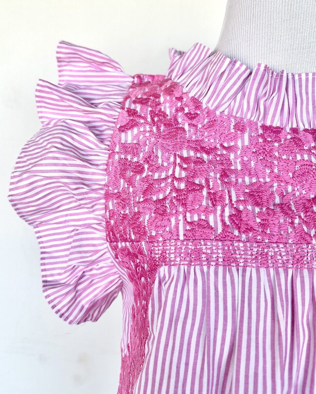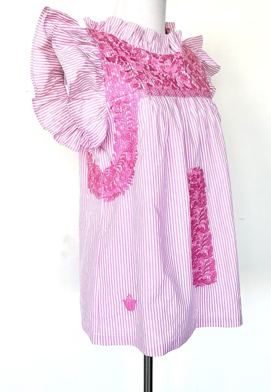 Pink and white striped color base with beautifully embroidered floral design.