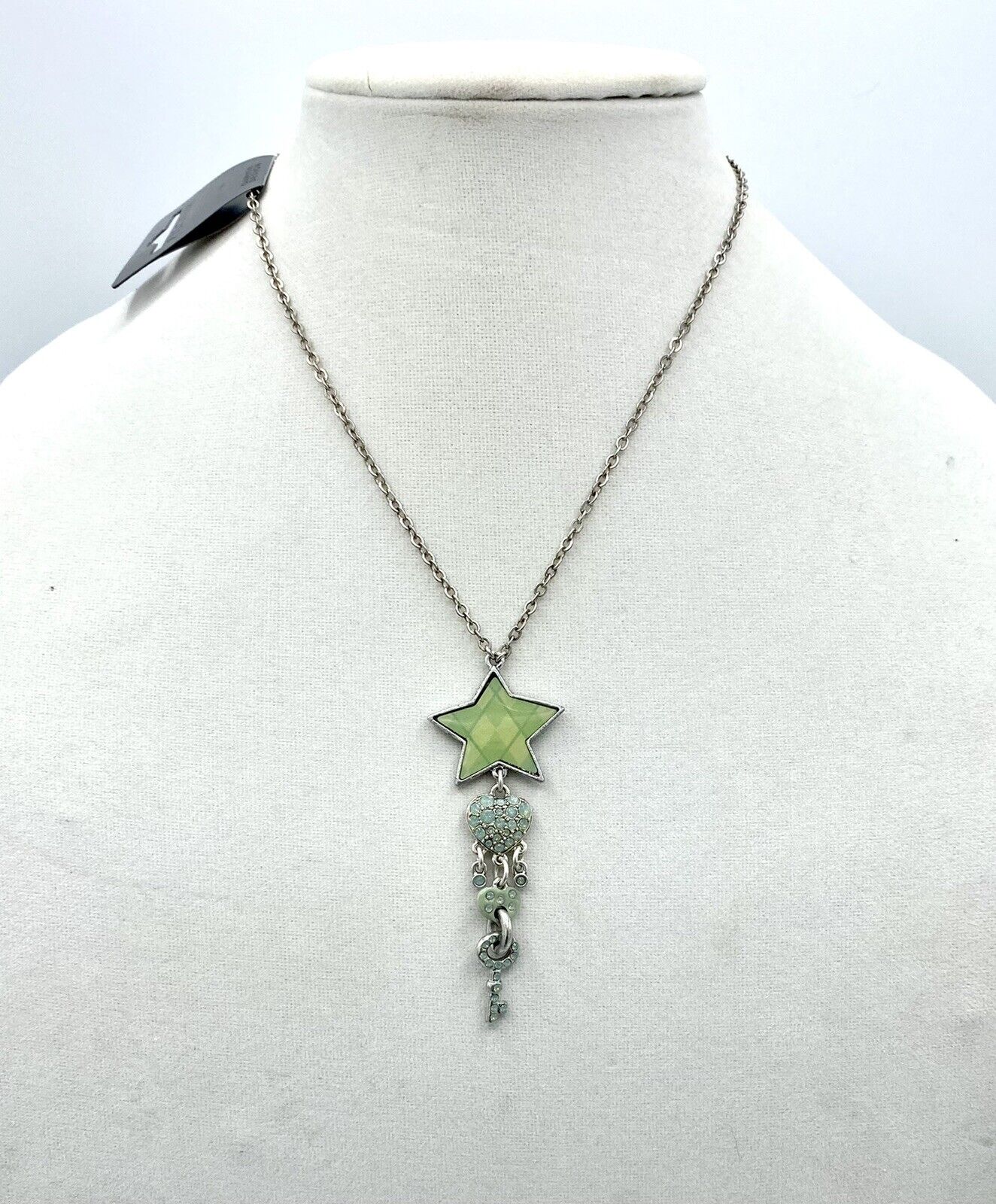 Swarovski crystals set into the design that sparkle in the light.Enameled star design with attached heart and key that is embedded with genuine Swarovski crystals.