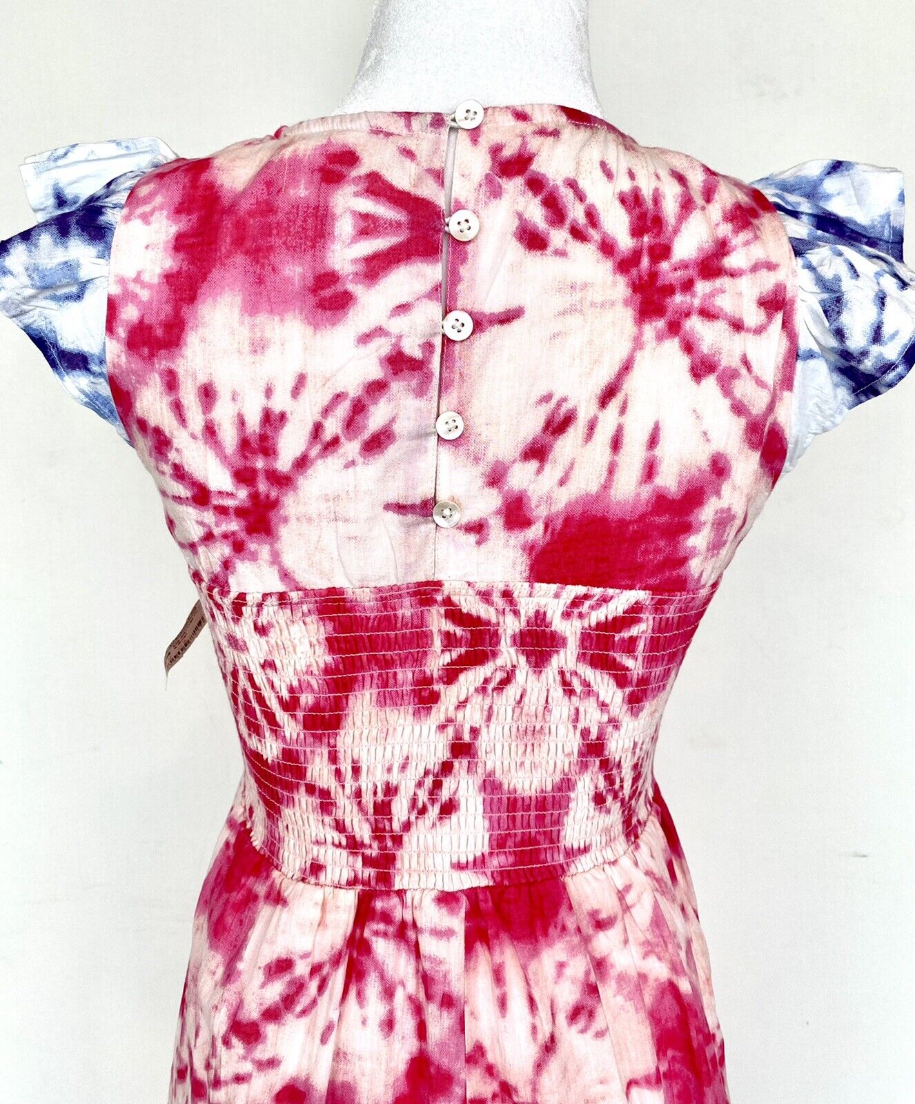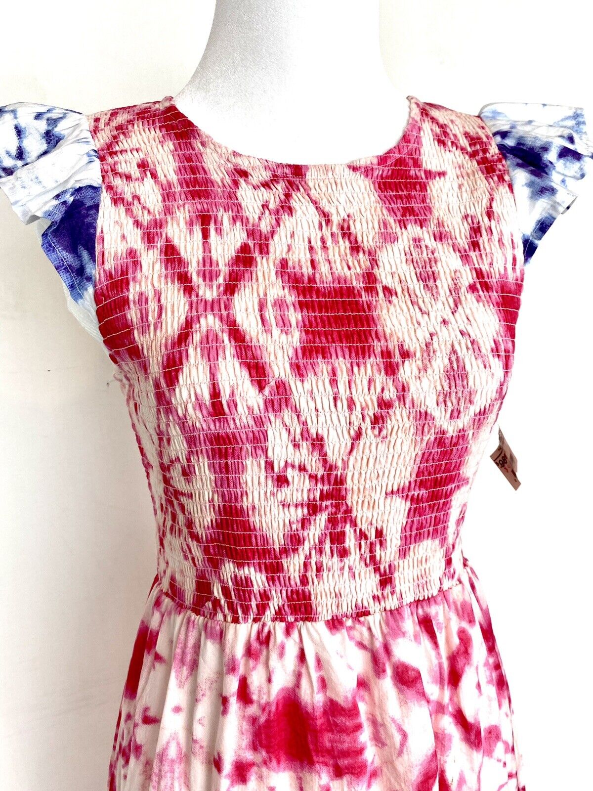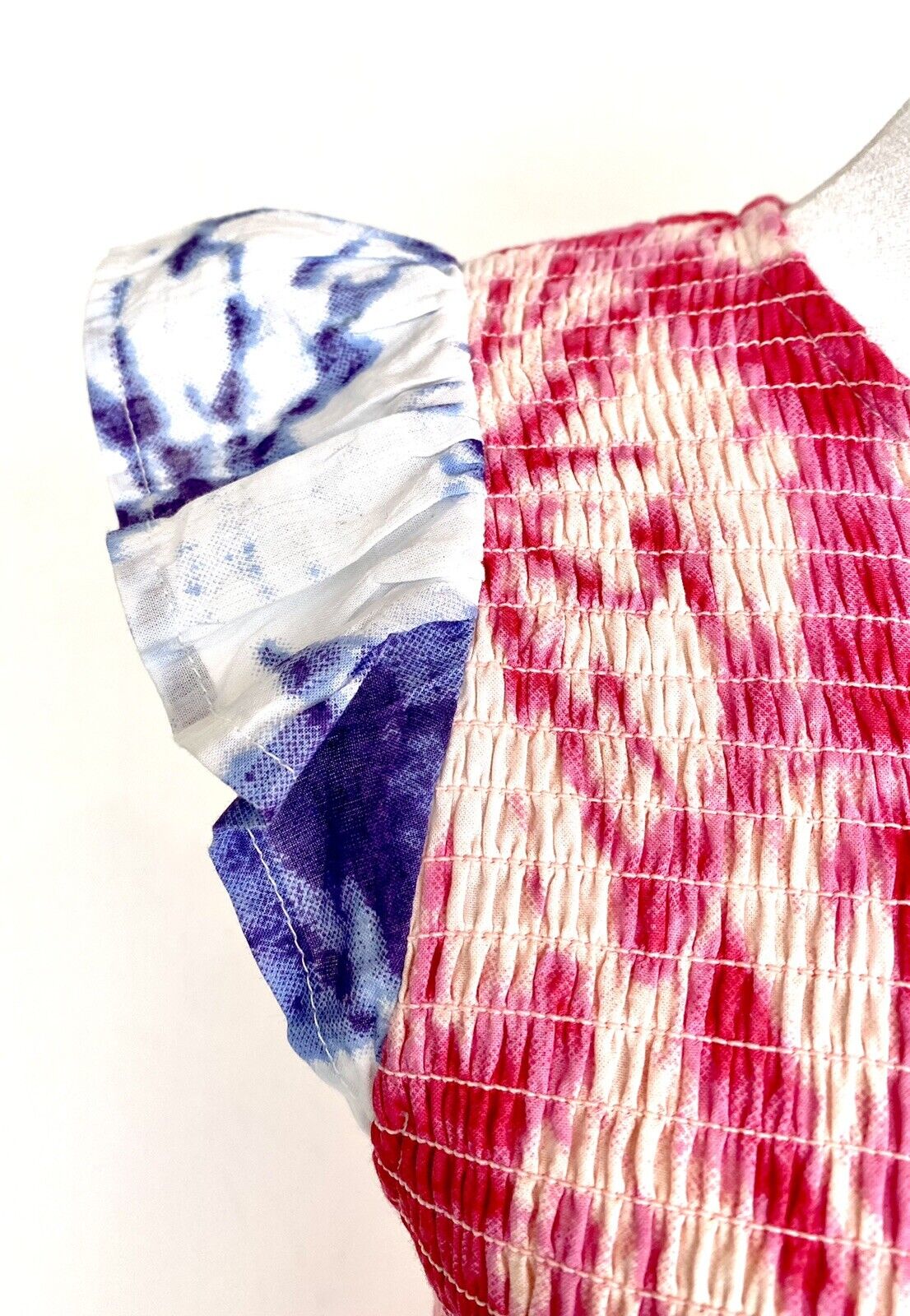 Tie dye pattern with pink and white on the body of the dress and blue and white on the sleeves.