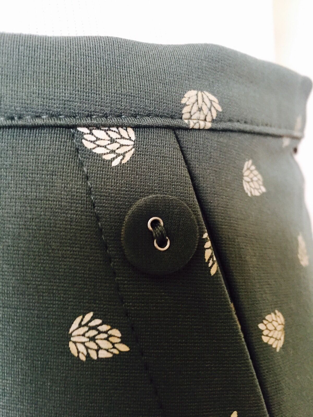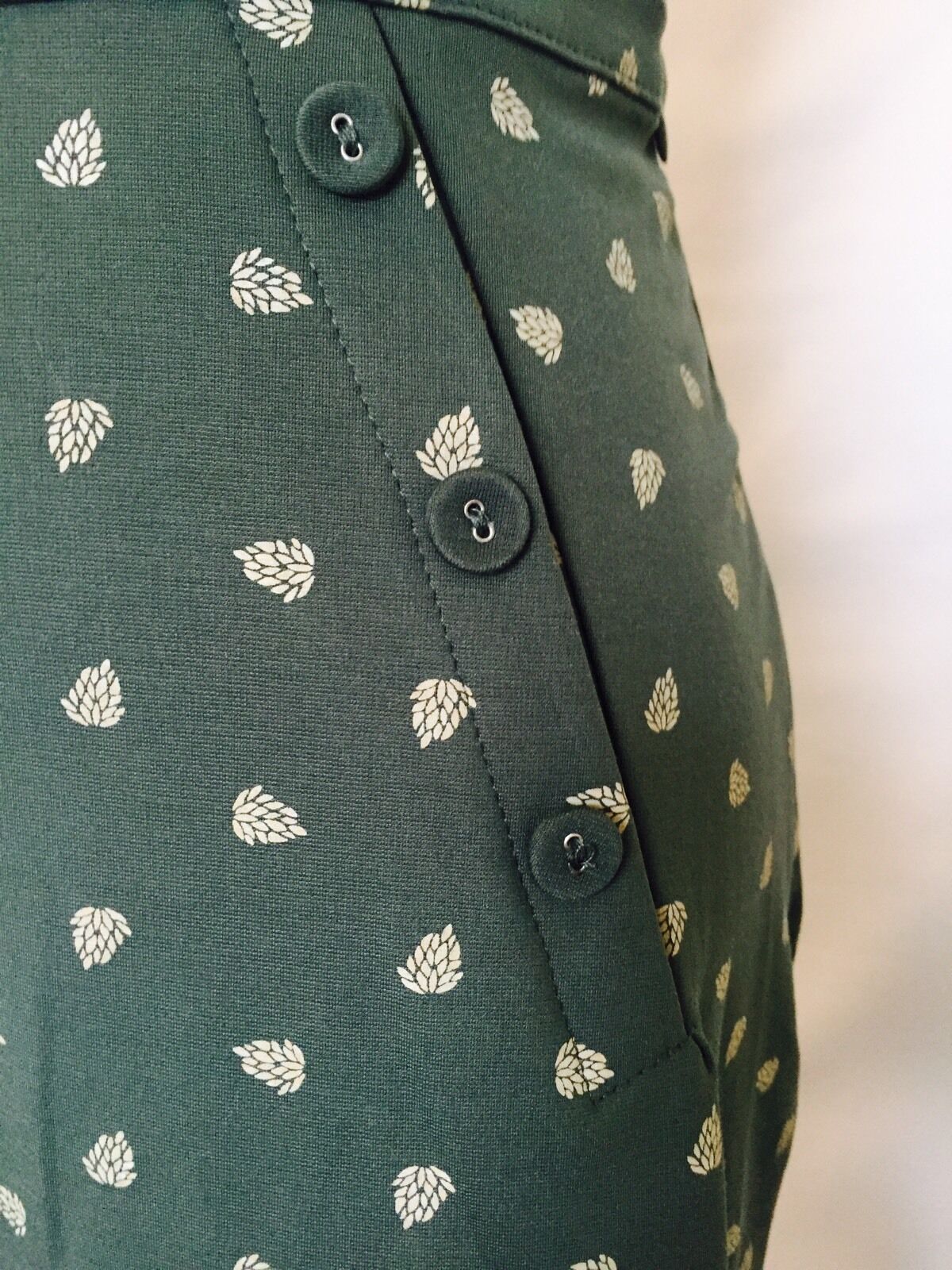 Green A line skirt with leaf pattern. From Spanish designer Titis Clothing.Size M vintage style with beautiful details like fabric covered buttons.